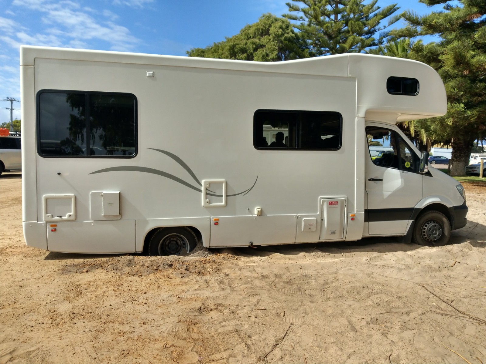 Gegenüber des eigentlichen Parkplatzes stehen viele lange Fahrzeuge (Jeeps mit Wohnwagen, große Camper, etc.) und ich entscheide, auch dort zu parken. Beim Auffahren sehe ich einen Camper, der sich festgefahren hat und so steuere ich zurück zur Straße und parke lieber einige Meter weiter vom Supermarkt entfernt. Mein Sohn will mir weismachen, Opa am eingegrabenen Wohnmobil gesehen zu haben. Ich erkläre ihm, was eine Fata Morgana ist und gehe nach hinten durch, um Noah zu holen. Plötzlich wird die Fata Morgana Realität: Nici steht mit einer irren Mischung aus Verzweiflung und Belustigung vor mir und zeigt kichernd auf das im Sand spielende Wohnmobil, das sich tatsächlich als Opas entpuppt. Ich ahne, was jetzt kommt und stöhne innerlich bereits.